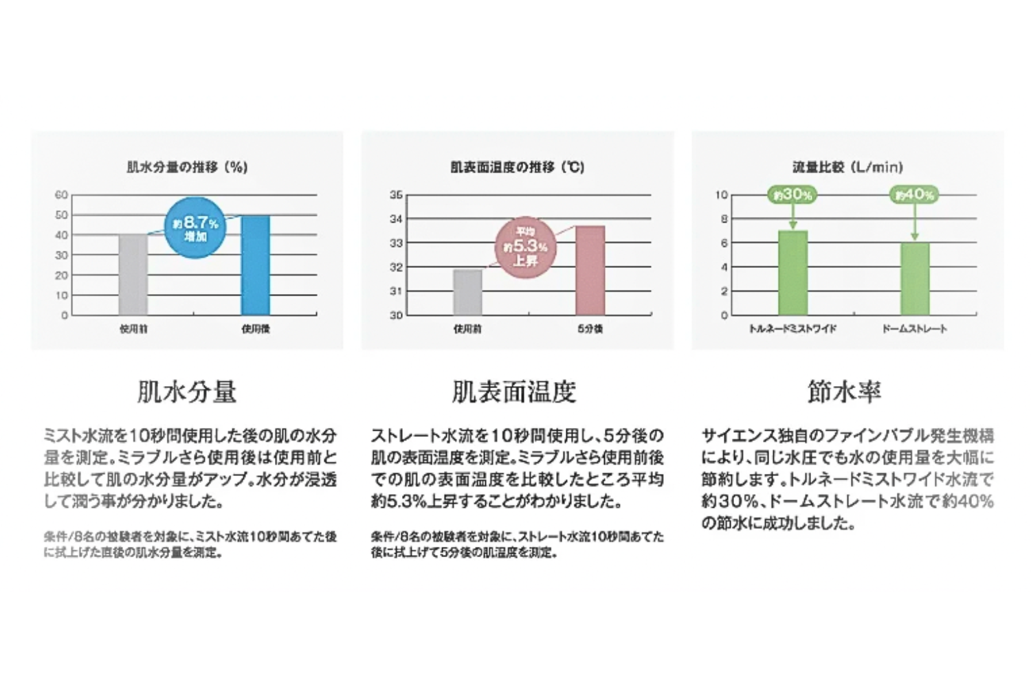 さらに、たっぷりの水量を広角度で噴出するドームストレートで、 パワフルな浴び心地を可能に。 吐水口に内蔵したボールが 高速回転しながらバブルを発生させると同時に、水が出る穴を瞬間的に塞いで水量を調整し、リズミカルに叩くような水流で、 肌の表面の汚れやベタつきを弾き飛ばしてすっきりと洗い上げます。