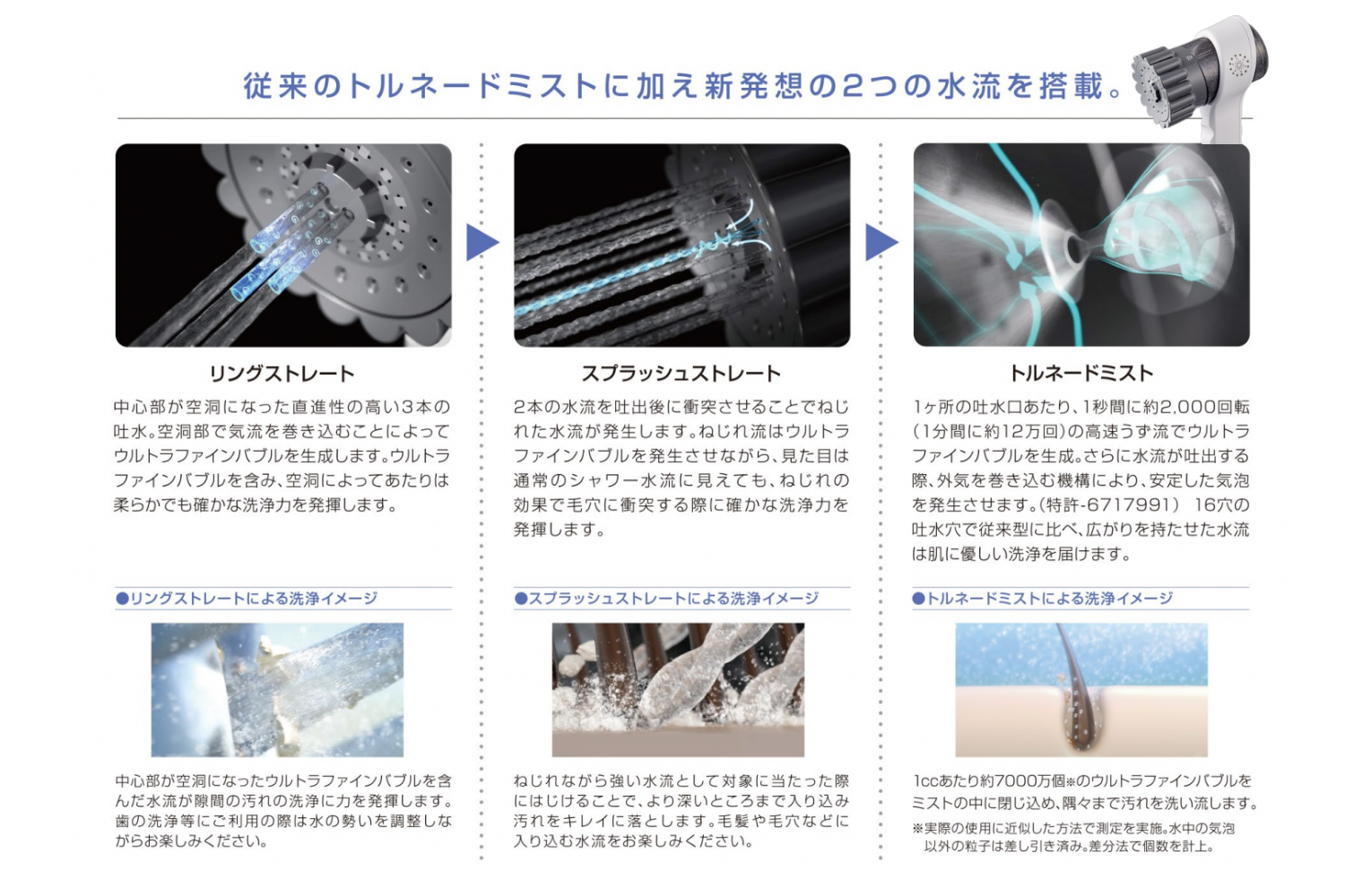 ウルトラファインバブルを含んだ3つの水流による洗浄実感をお楽しみ頂けます。
