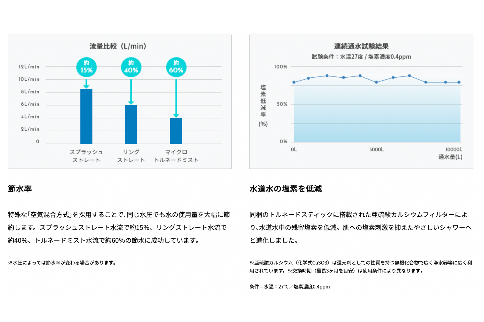 2本の水流を吐出後に衝突させることでねじれた水流が発生します。ねじれ流はウルトラ ファインバブルを発生させながら、見た目は通常のシャワー水流に見えても、ねじれの効果で毛穴に衝突する際に確かな洗浄力を発揮します。